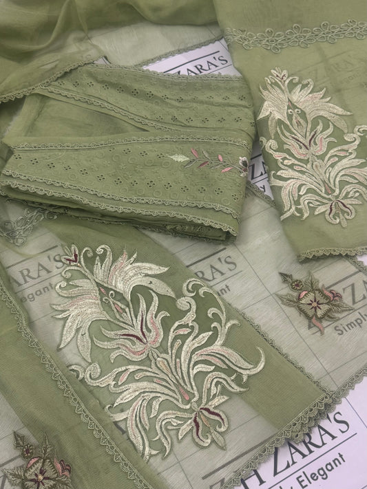 Olive Mint Green Resham Silk Cutwork 3pc