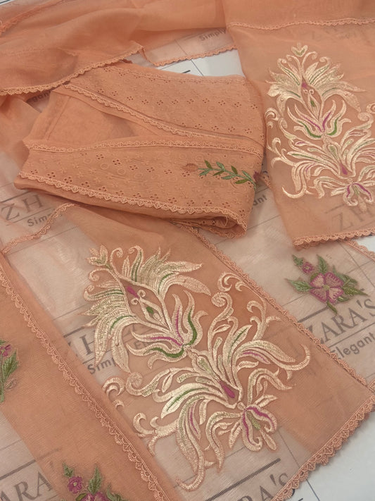 Sold outPeachy Pink Resham Silk Cutwork 3pc
