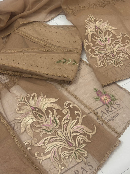 Coffee Gold EMB Co-Ord Set Stitched