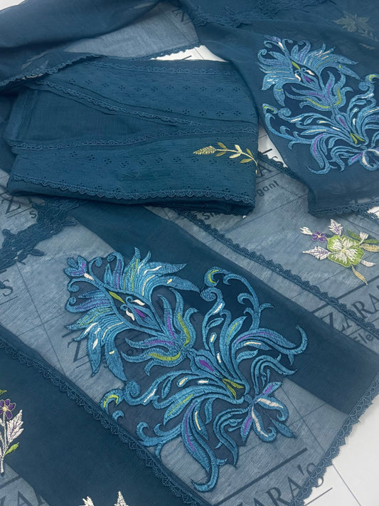 Peacock Teal Green Resham Silk Cutwork 3pc