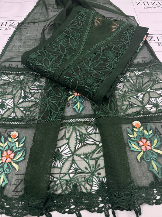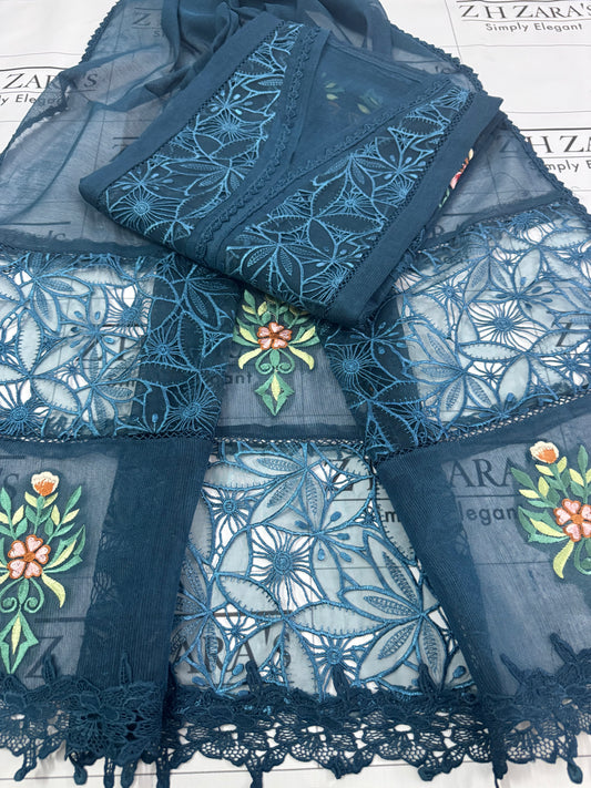 Peacock Teal Green Resham Silk Cutwork 3pc