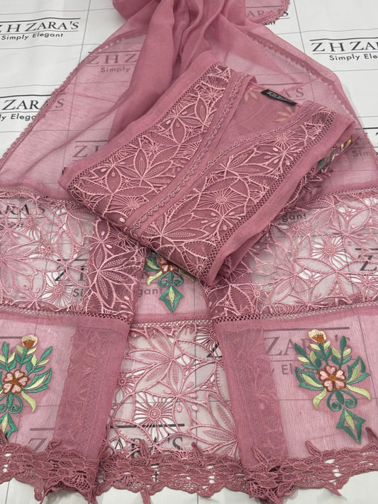 Sold outPeachy Pink Resham Silk Cutwork 3pc