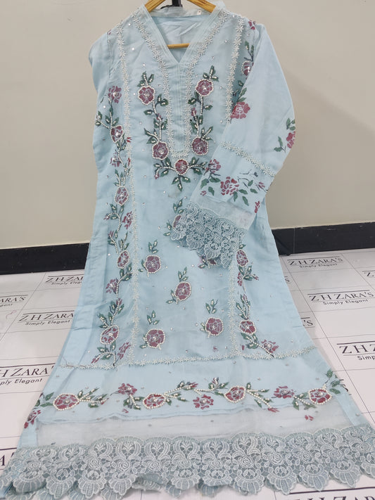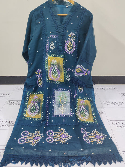 Peacock Blue Frame Hand Painted Stitched 2pc