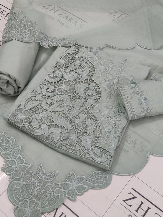 Peacock Teal Green Resham Silk Cutwork 3pc