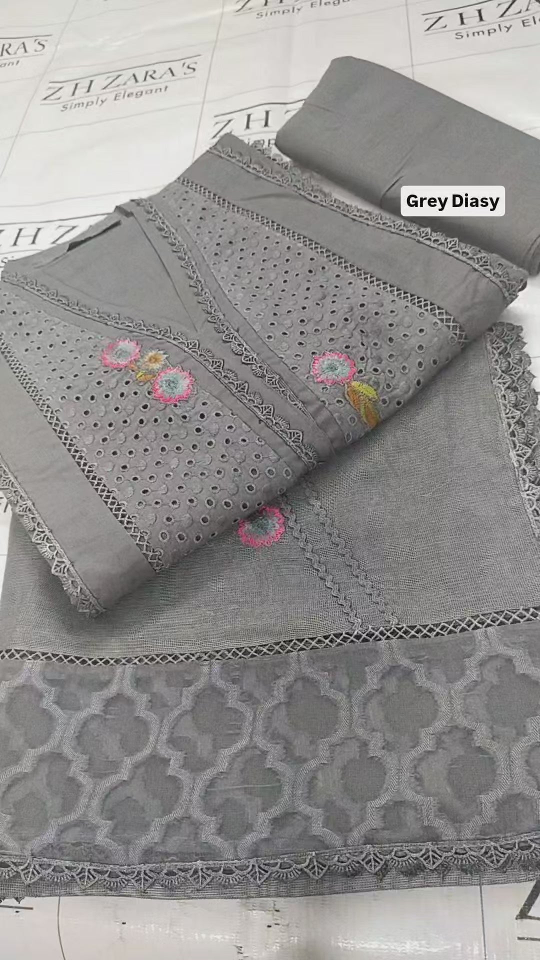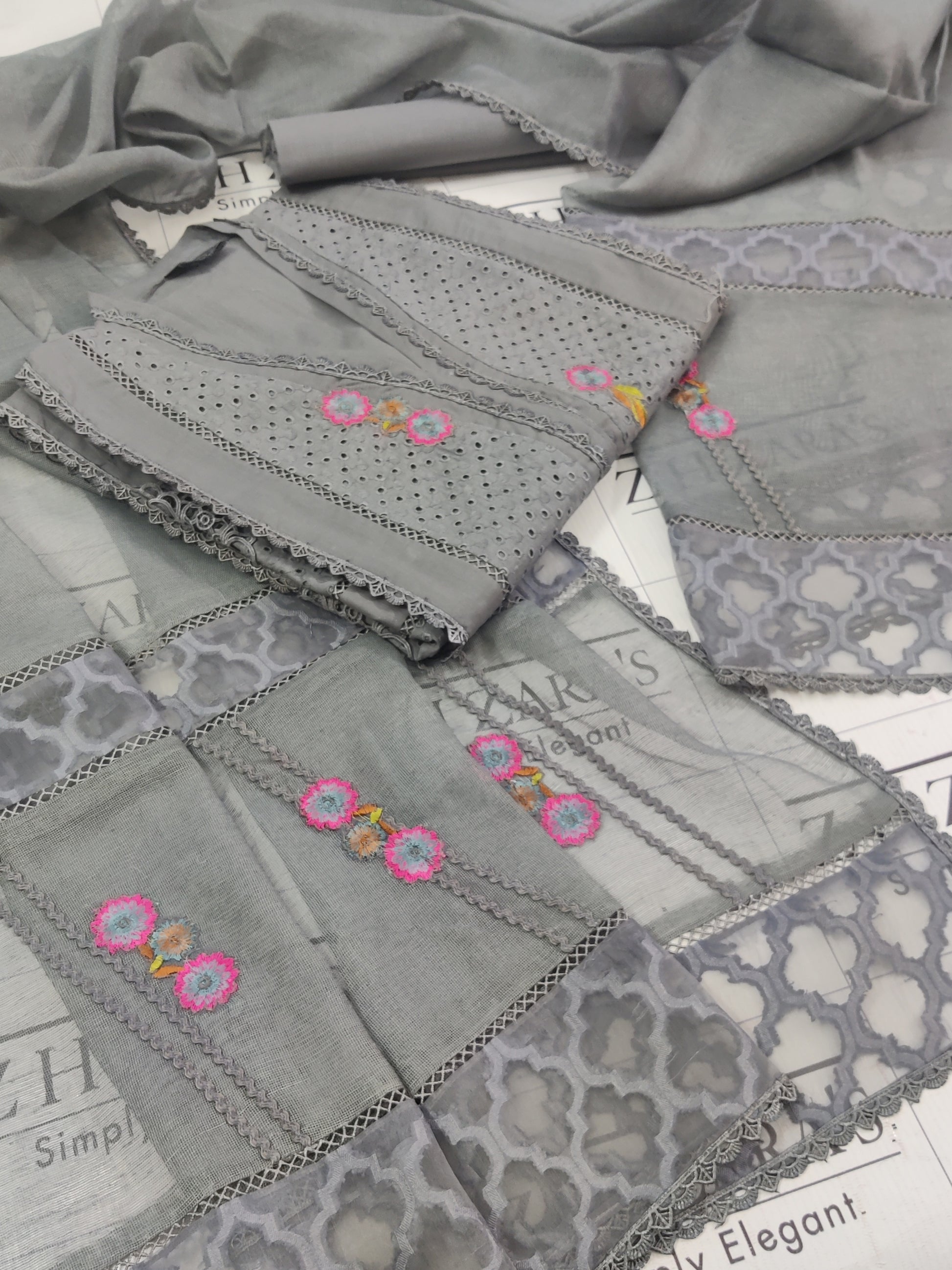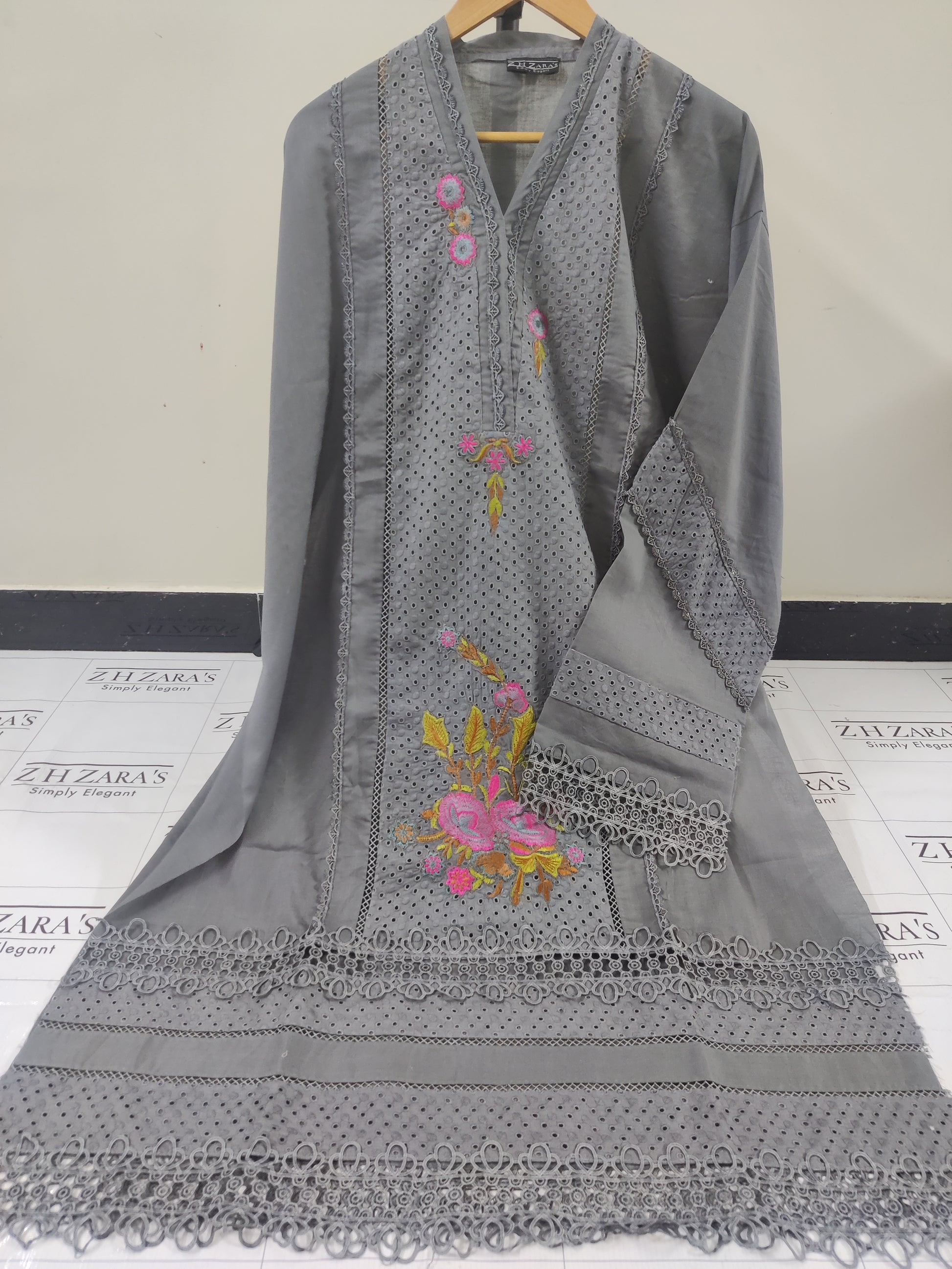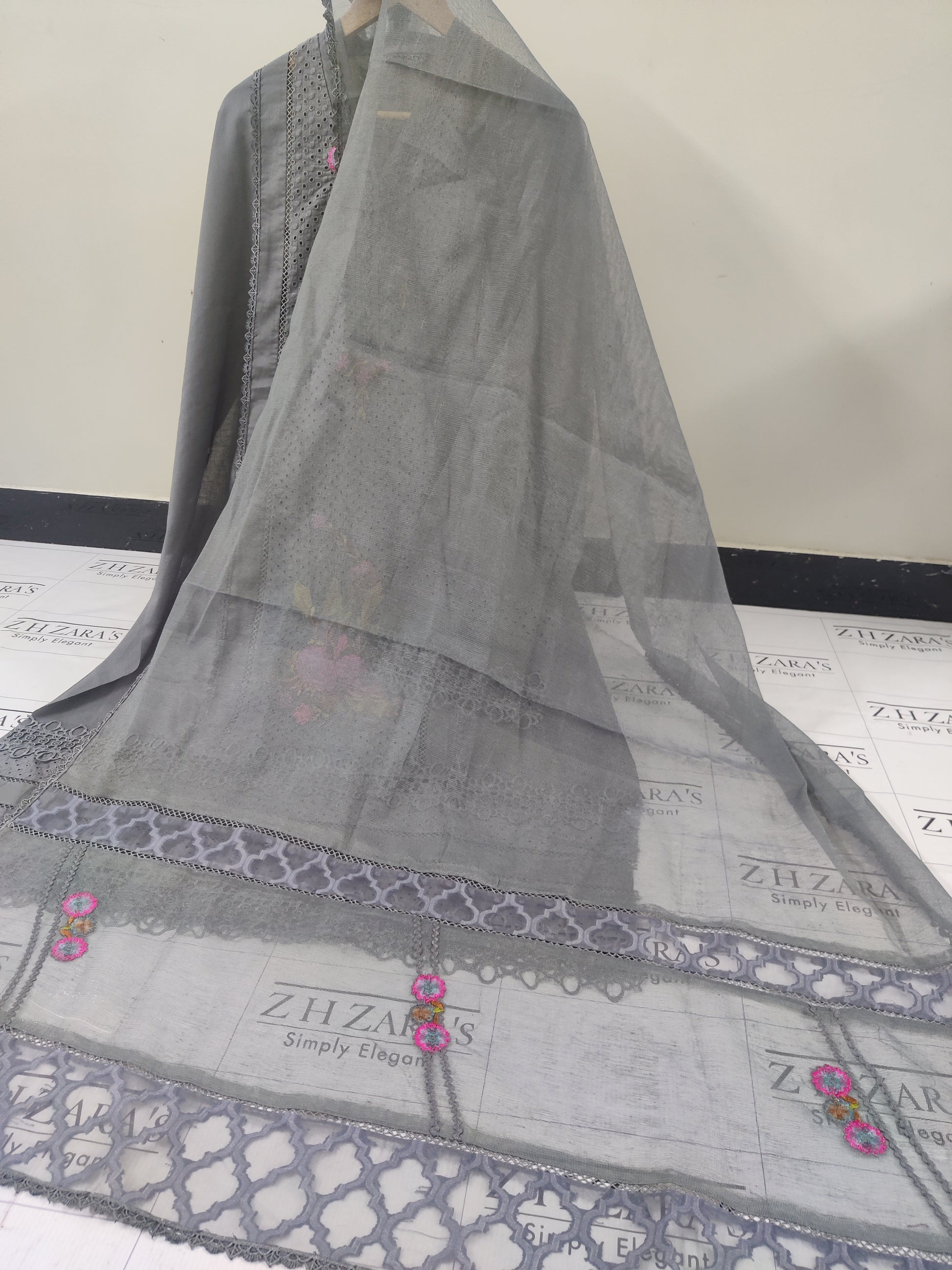 This Luxury shirt with stunning details in multi embroidery and chikan center panel . It is complimented with an eye-catching embroidery paneled cotton net dupatta.