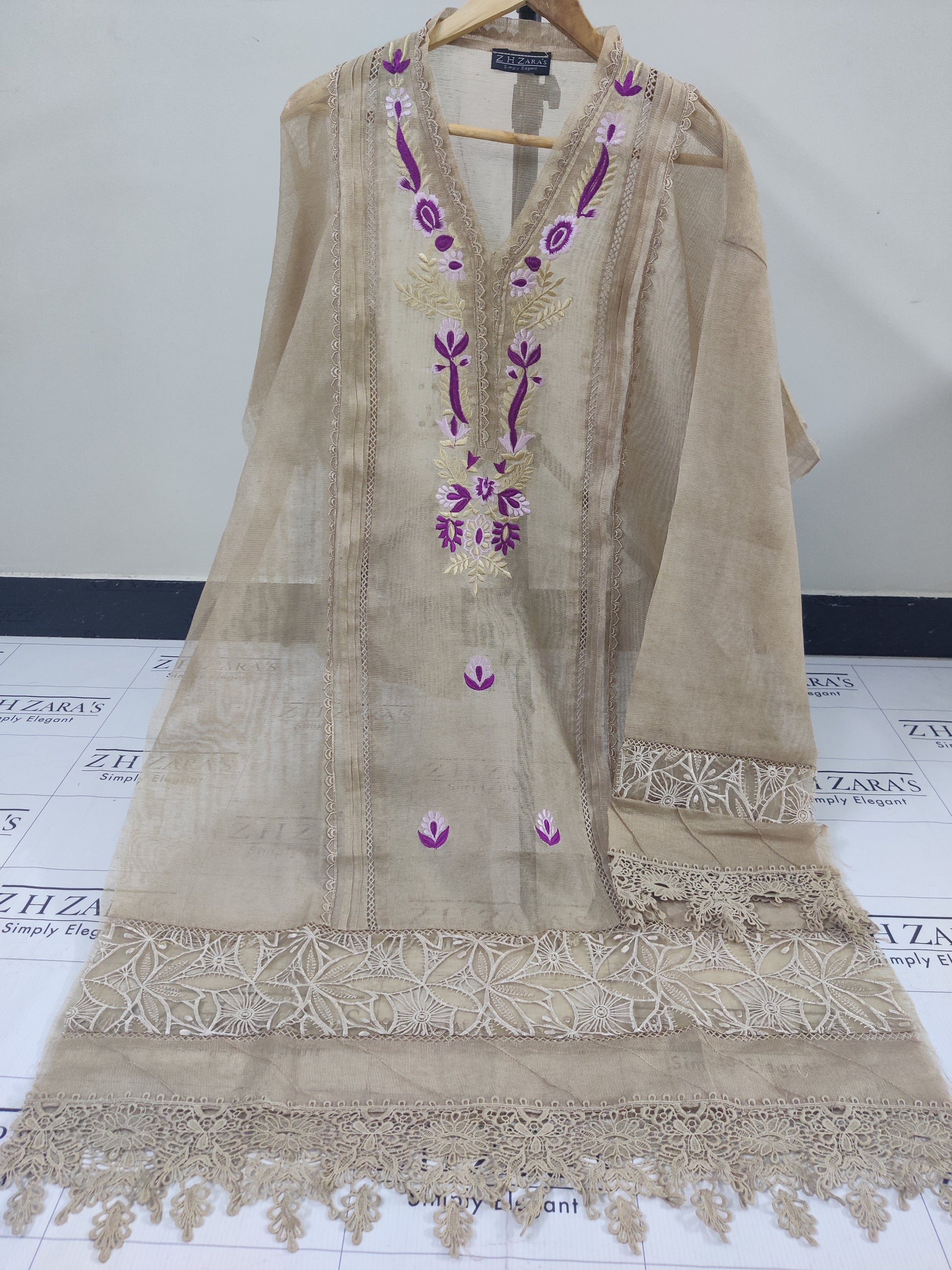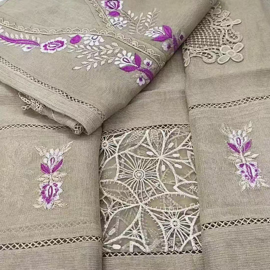 This cotton net shirt with Multi Panels and pastel chromatic embroidery and cutwork Daman paired with Embroidered duppta. Perfect for this Season.