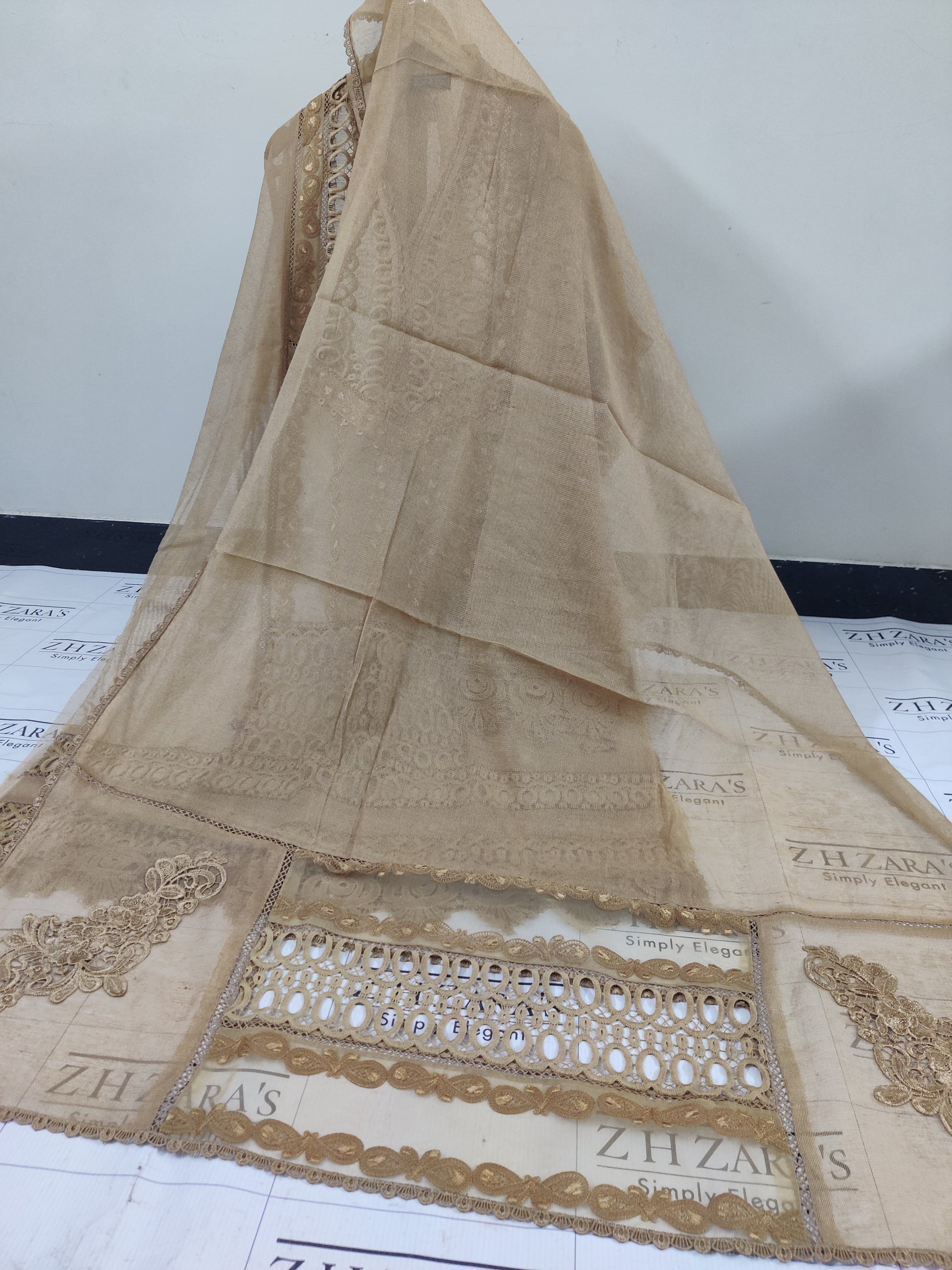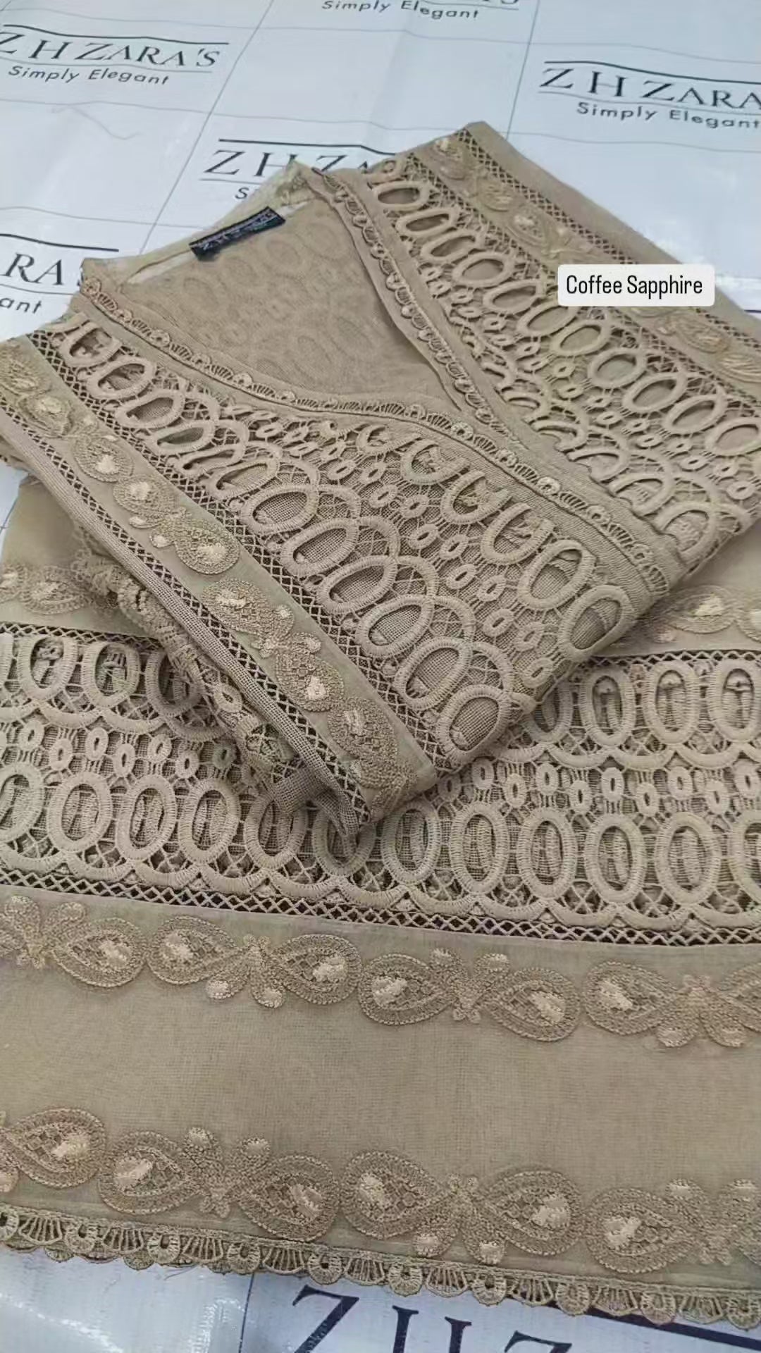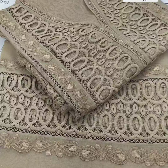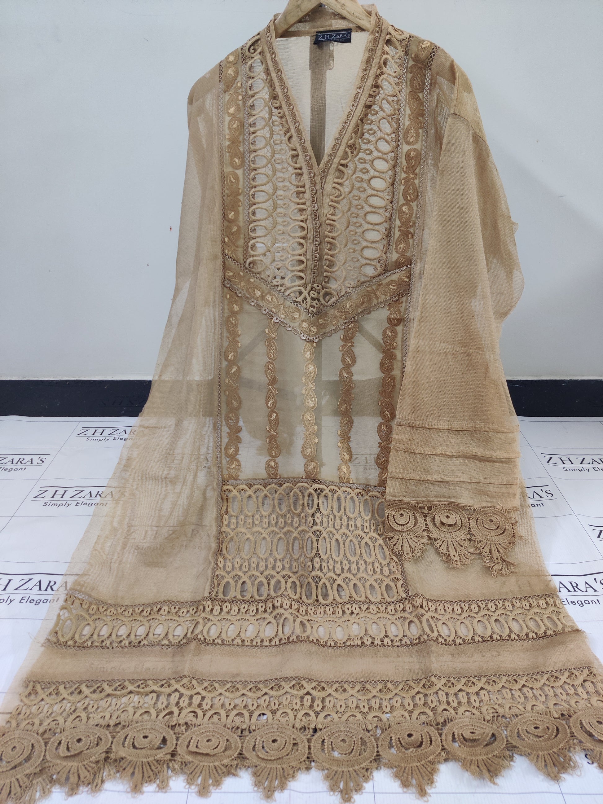 Elevate your wardrobe with our stunning collection featuring intricate crochet panels, delicate laces, and exquisite crochet cutwork Daman. Our pieces offer timeless style and unparalleled craftsmanship. Paired with crochet and embroidery net duppata.