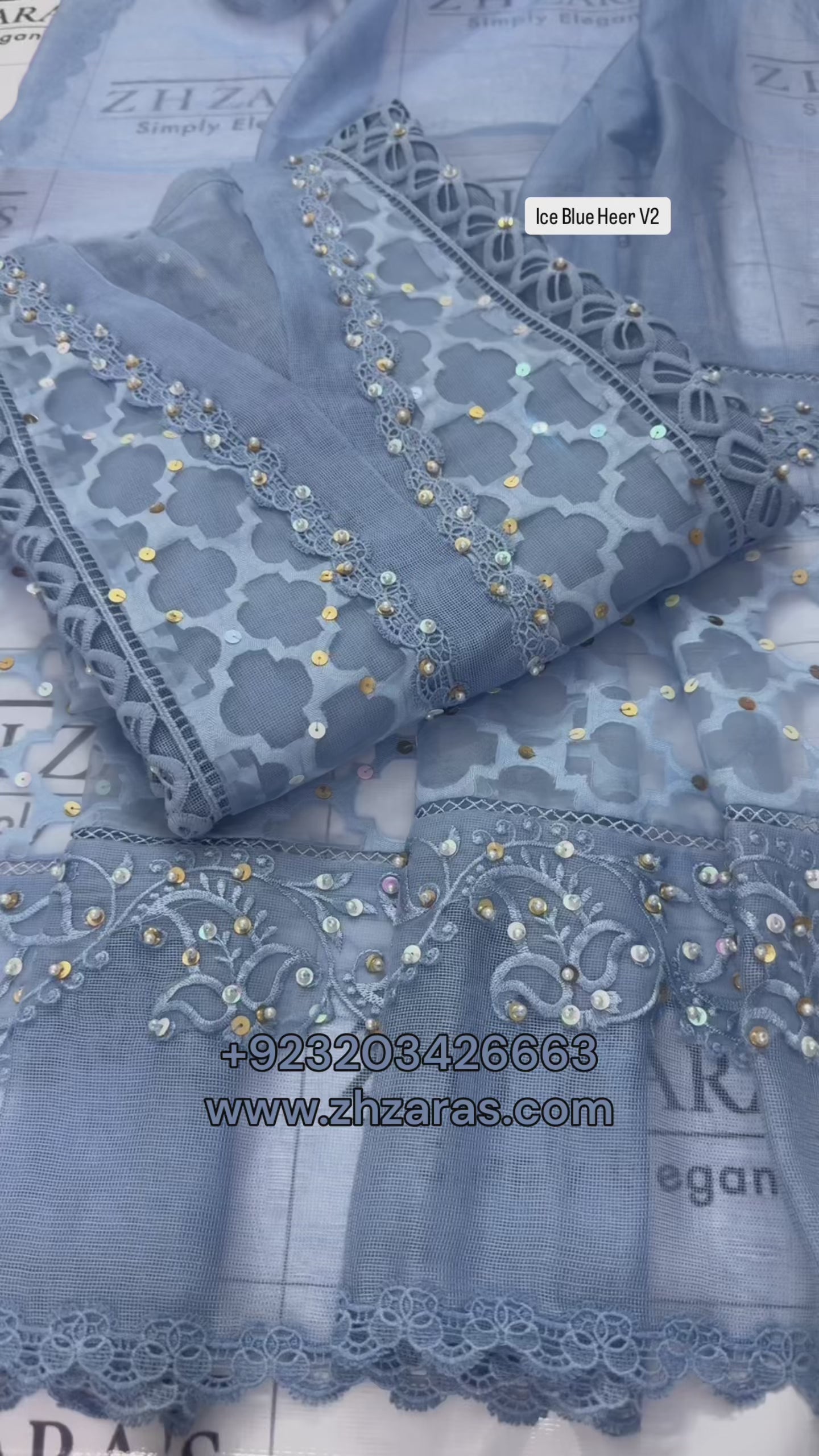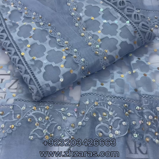 This cotton net shirt is hand embellished with pearls and sequences laces along the front and sleeves paired with a cotton net dupatta with handwork and embroidery for a perfect evening look.