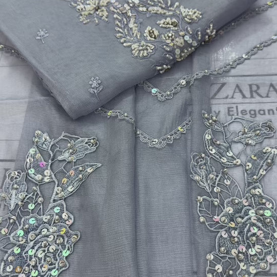 This cotton net shirt is hand embellished with pearls and sequences laces along the front and sleeves paired with a cotton net dupatta four sides handwork bunches and embroidery for a perfect evening look.