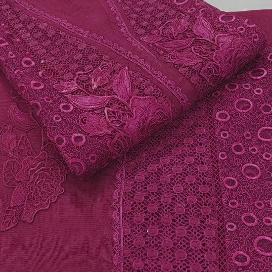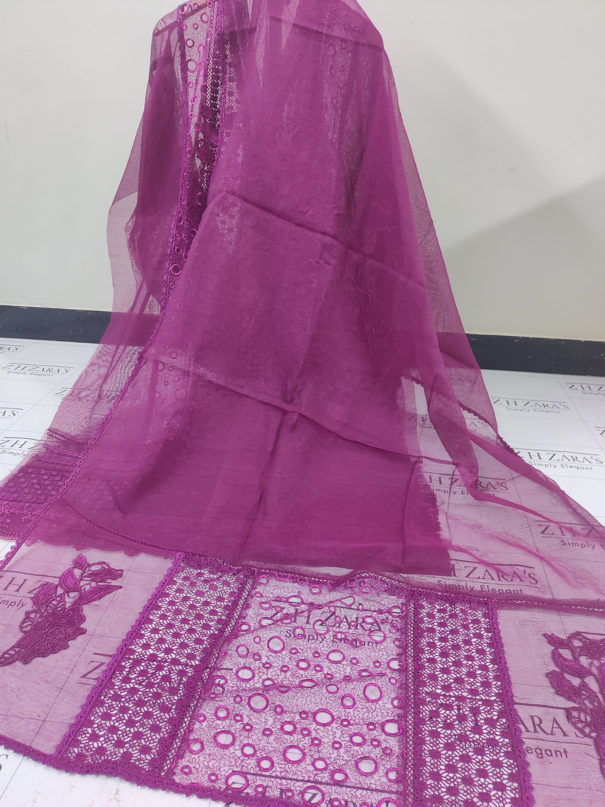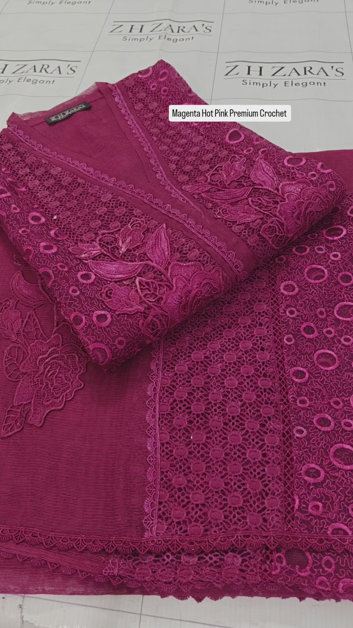 Elevate your wardrobe with our stunning collection featuring intricate crochet panels, delicate laces, and exquisite cutwork embroidery Daman. Our pieces offer timeless style and unparalleled craftsmanship. Paired with crochet and embroidery net duppata.