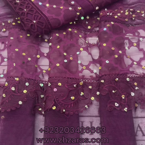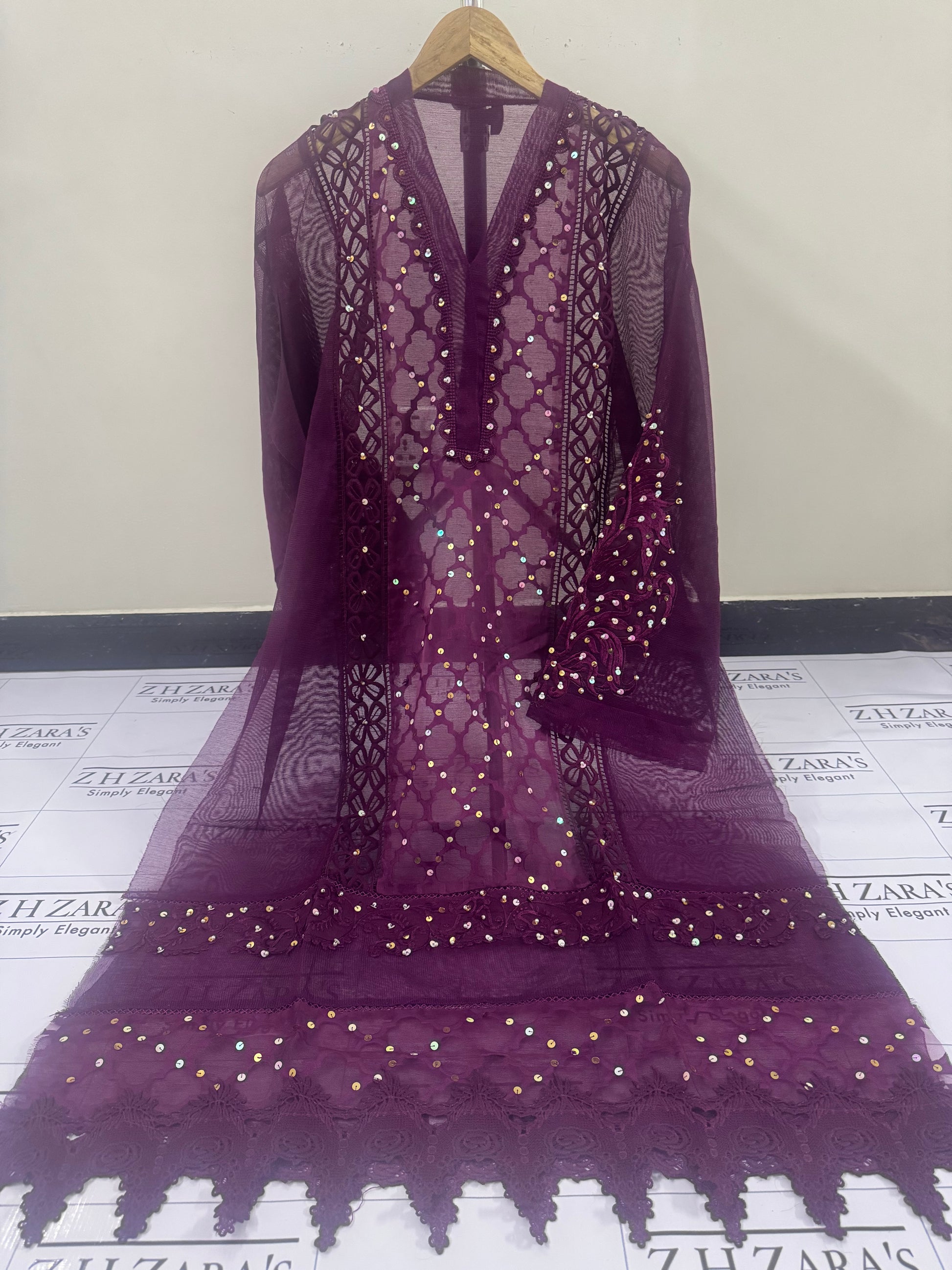 This cotton net shirt is hand embellished with pearls and sequences laces along the front and sleeves paired with a cotton net dupatta with handwork and embroidery for a perfect evening look.