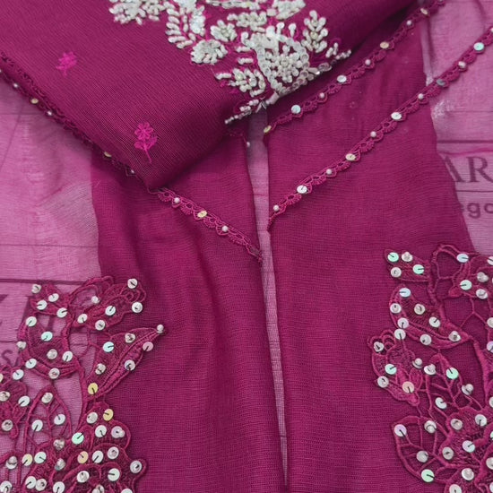 This cotton net shirt is hand embellished with pearls and sequences laces along the front and sleeves paired with a cotton net dupatta four sides handwork bunches and embroidery for a perfect evening look.