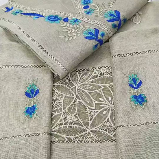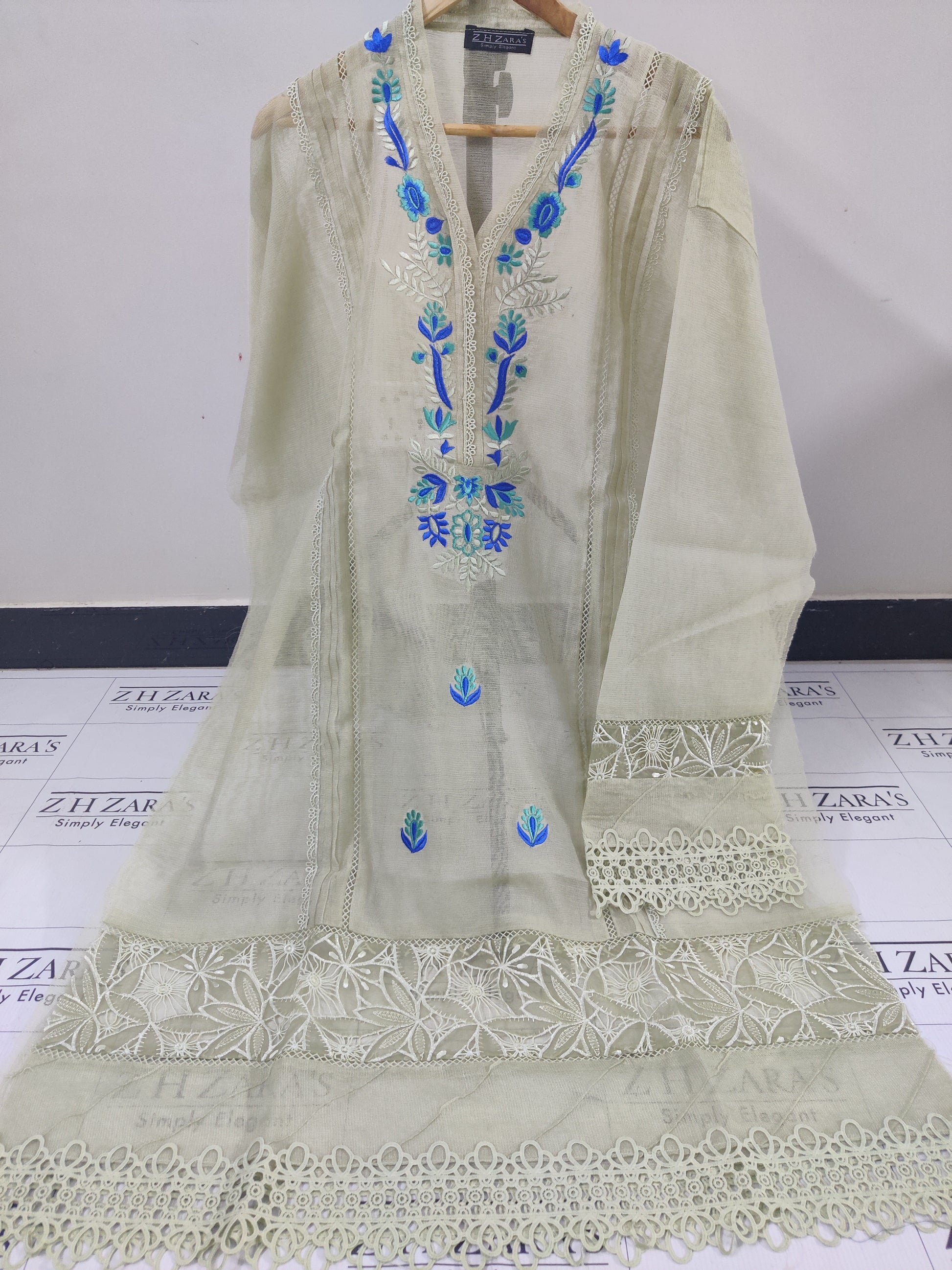 This cotton net shirt with Multi Panels and pastel chromatic embroidery and cutwork Daman paired with Embroidered duppta. Perfect for this Season.