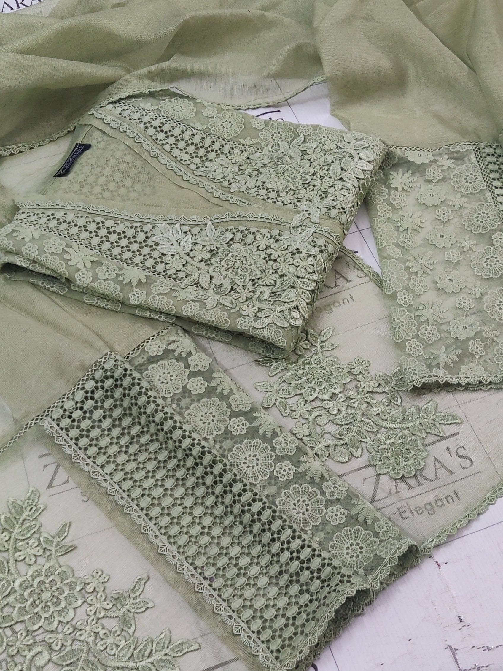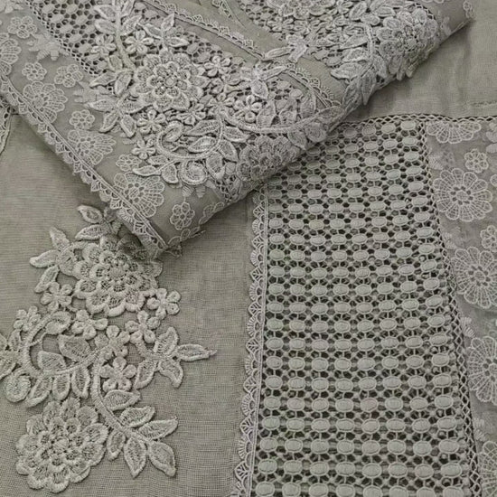 Elevate your wardrobe with our stunning collection featuring intricate crochet panels, delicate laces, and exquisite crochet cutwork Daman. Our pieces offer timeless style and unparalleled craftsmanship. Paired with crochet and embroidery net duppata.