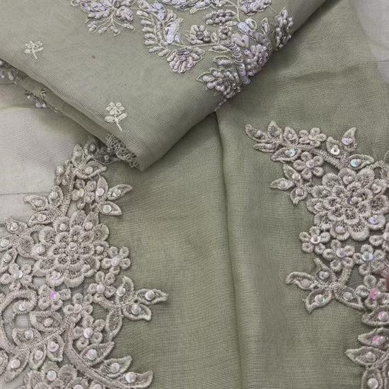 This cotton net shirt is hand embellished with pearls and sequences laces along the front and sleeves paired with a cotton net dupatta four sides handwork bunches and embroidery for a perfect evening look.
