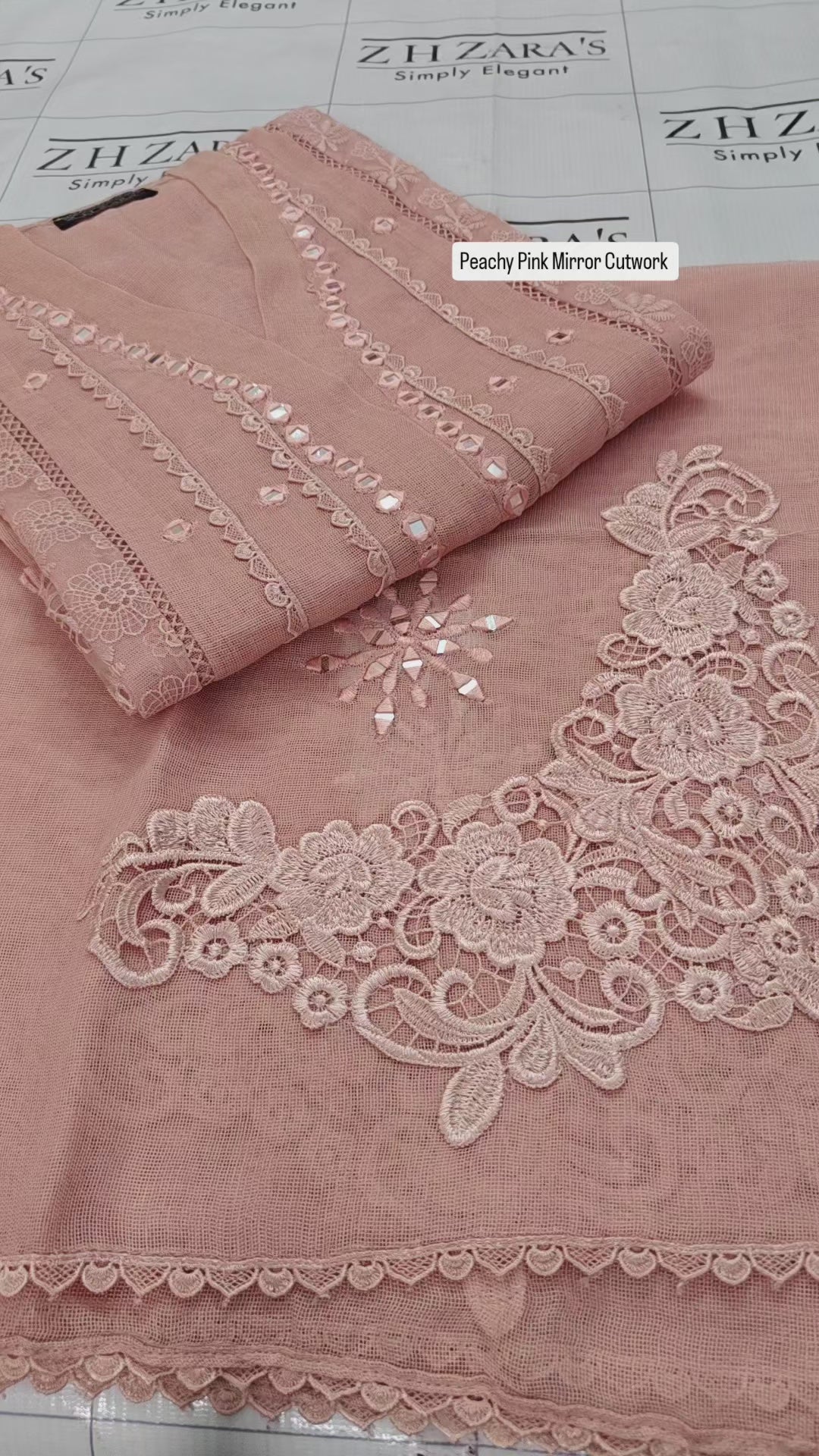 Adorn yourself with this glorious embroidered shirt with cutwork daman embroidery, embroidered sleeves with cutwork and sparkle of mirror. Paired with inner cutwork bunches 4 sided duppatta.