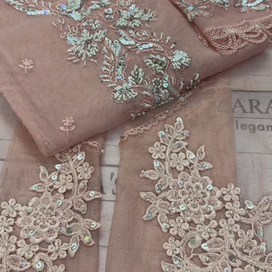 This cotton net shirt is hand embellished with pearls and sequences laces along the front and sleeves paired with a cotton net dupatta four sides handwork bunches and embroidery for a perfect evening look.