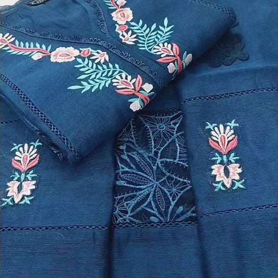 This cotton net shirt with Multi Panels and pastel chromatic embroidery and cutwork Daman paired with Embroidered duppta. Perfect for this Season.