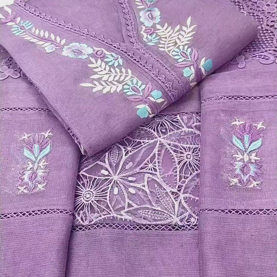 This cotton net shirt with Multi Panels and pastel chromatic embroidery and cutwork Daman paired with Embroidered duppta. Perfect for this Season.