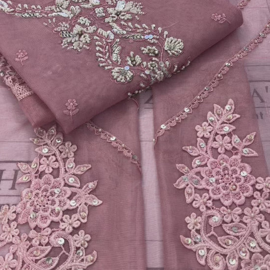 This cotton net shirt is hand embellished with pearls and sequences laces along the front and sleeves paired with a cotton net dupatta four sides handwork bunches and embroidery for a perfect evening look.