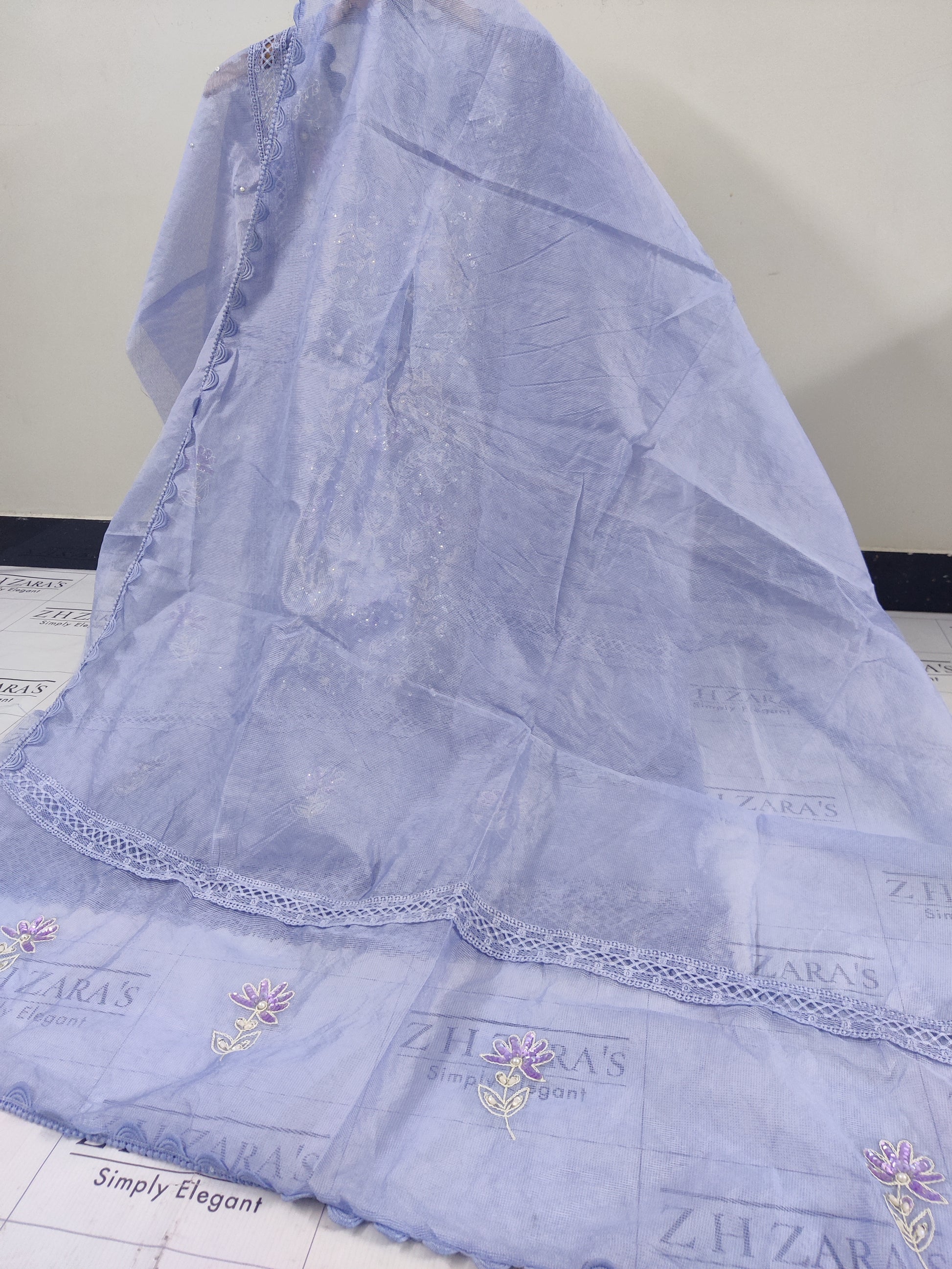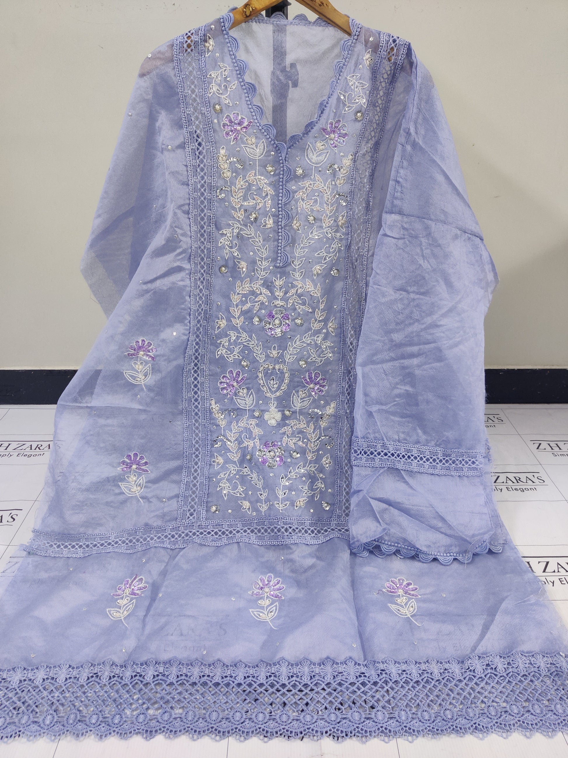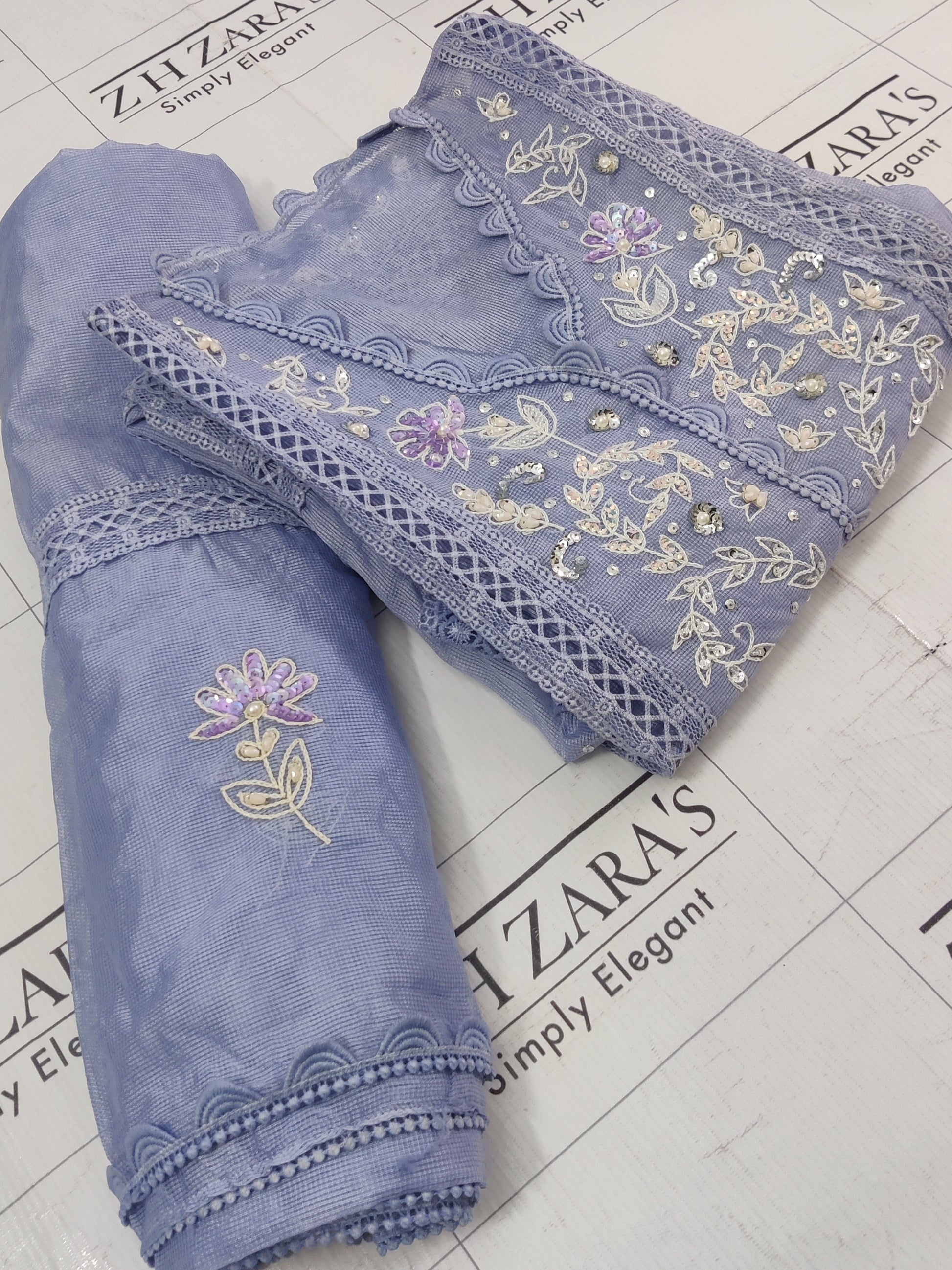 Stand out from the crowd in this elegant sparkling pair. Khadi Net shirt hand painted and hand Embellished with NAKSHI work paired with hand embellished Khaadi Net duppatta.