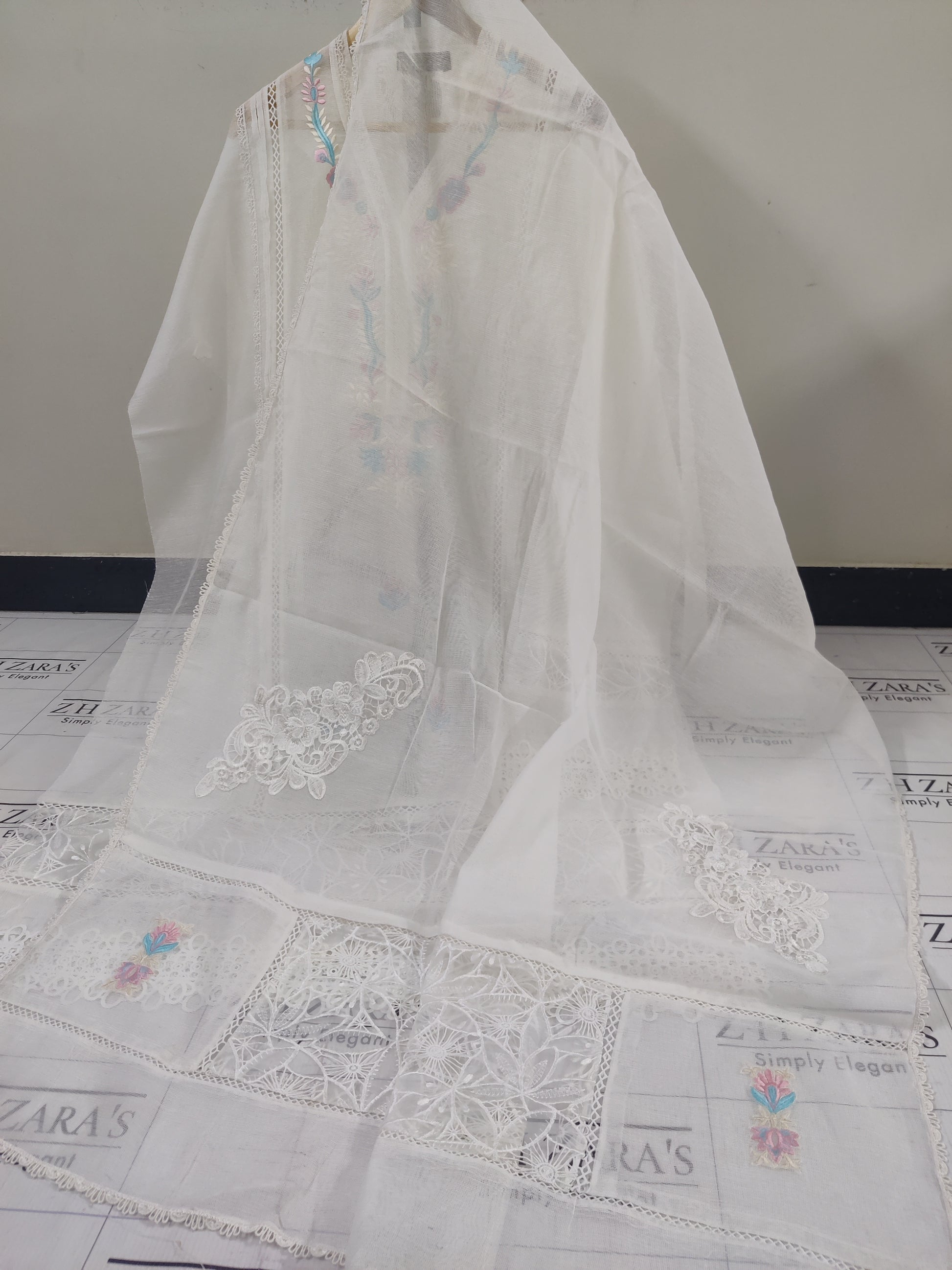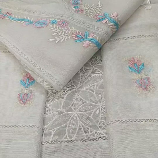This cotton net shirt with Multi Panels and pastel chromatic embroidery and cutwork Daman paired with Embroidered duppta. Perfect for this Season.