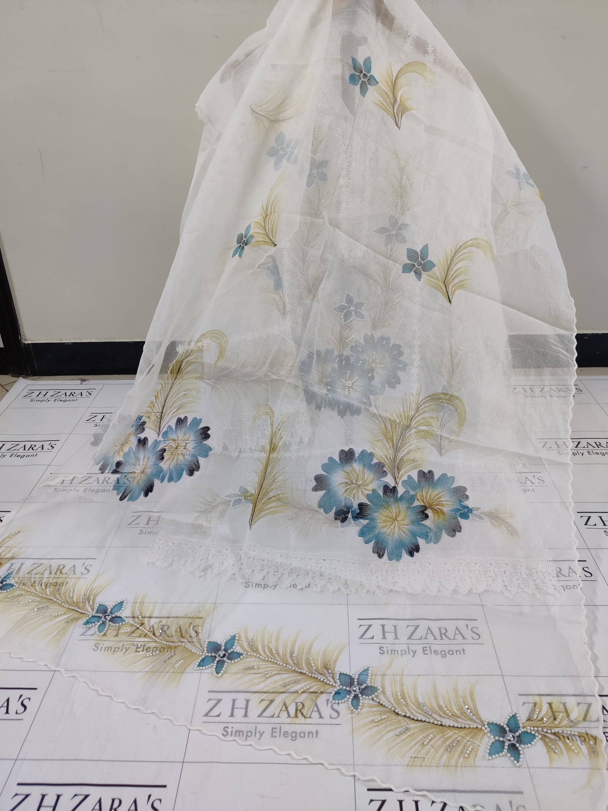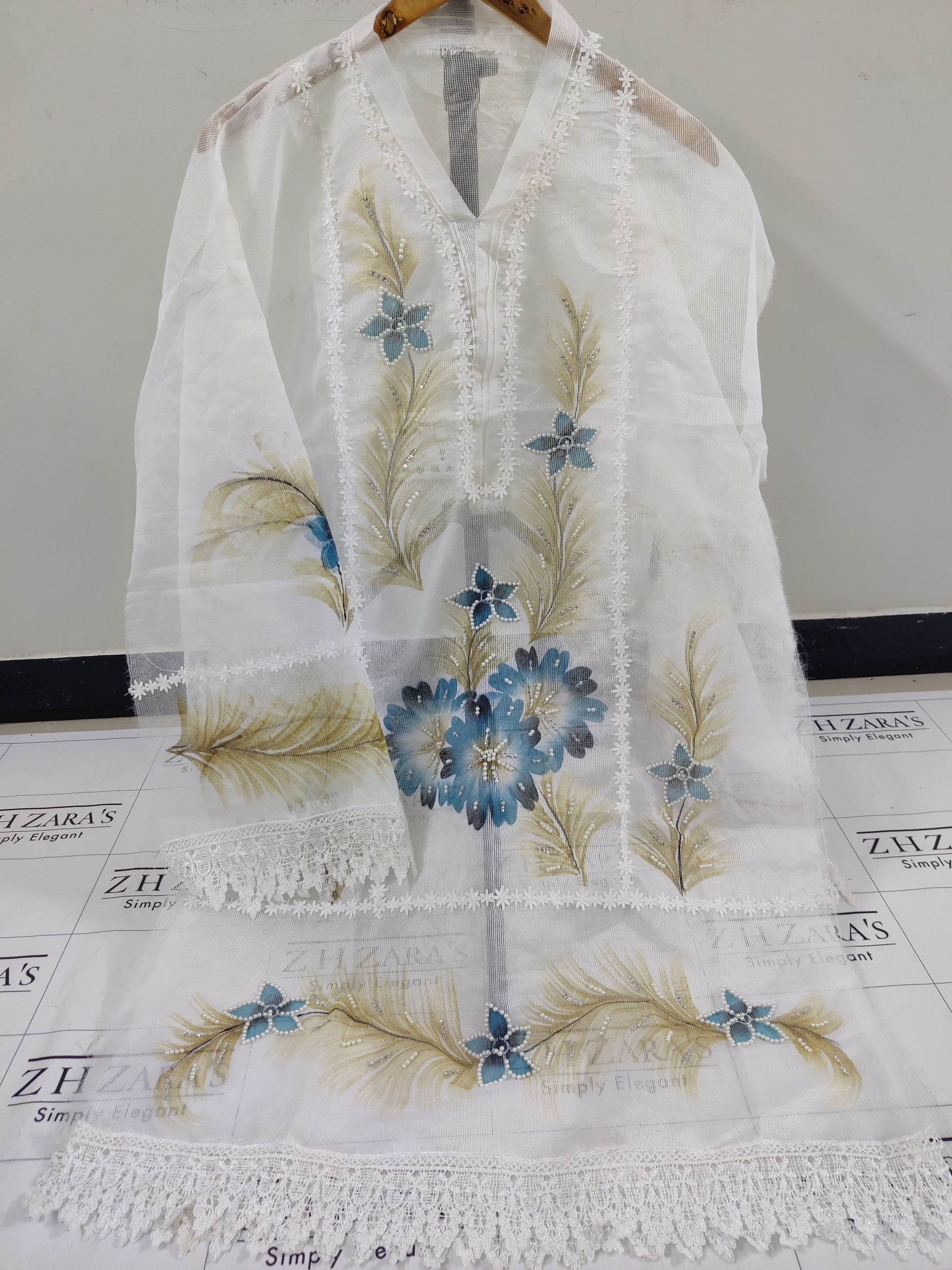 Stand out from the crowd in this elegant sparkling pair. Khadi Net shirt hand painted and hand Embellished with aari work paired with hand painted and hand embellished duppatta.