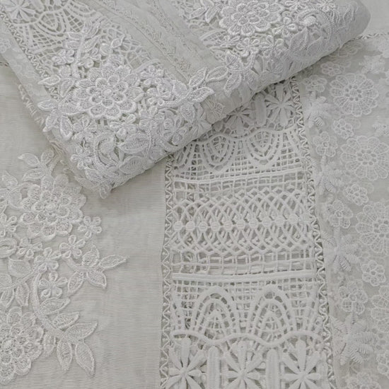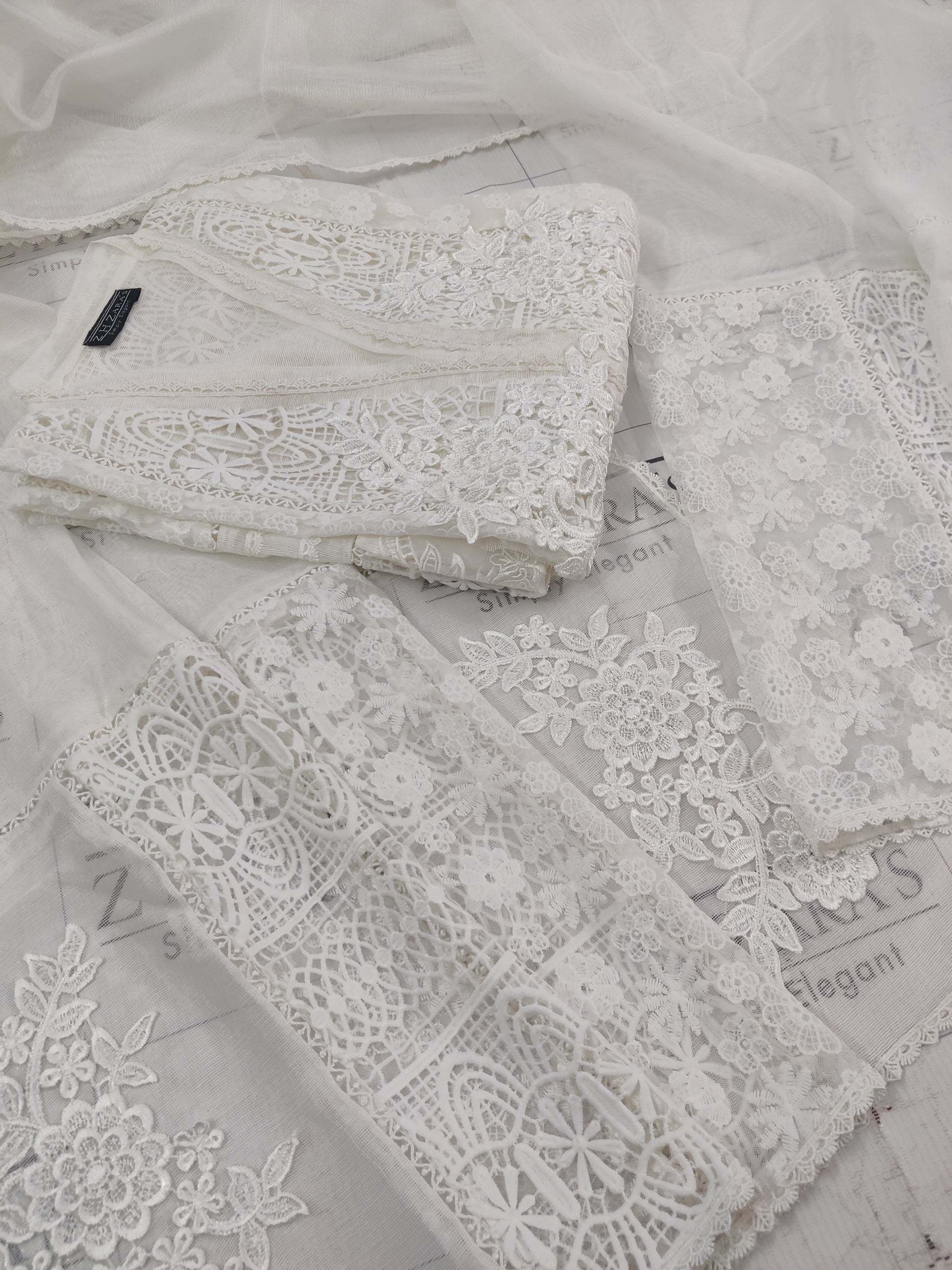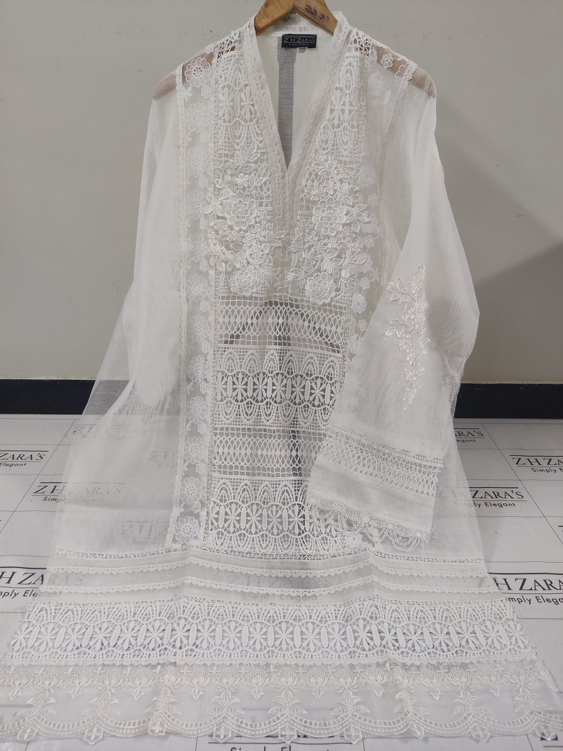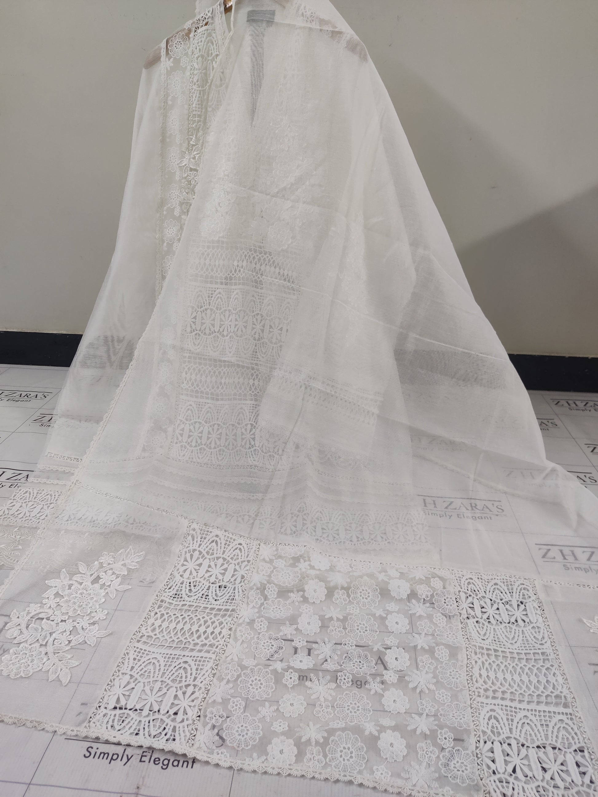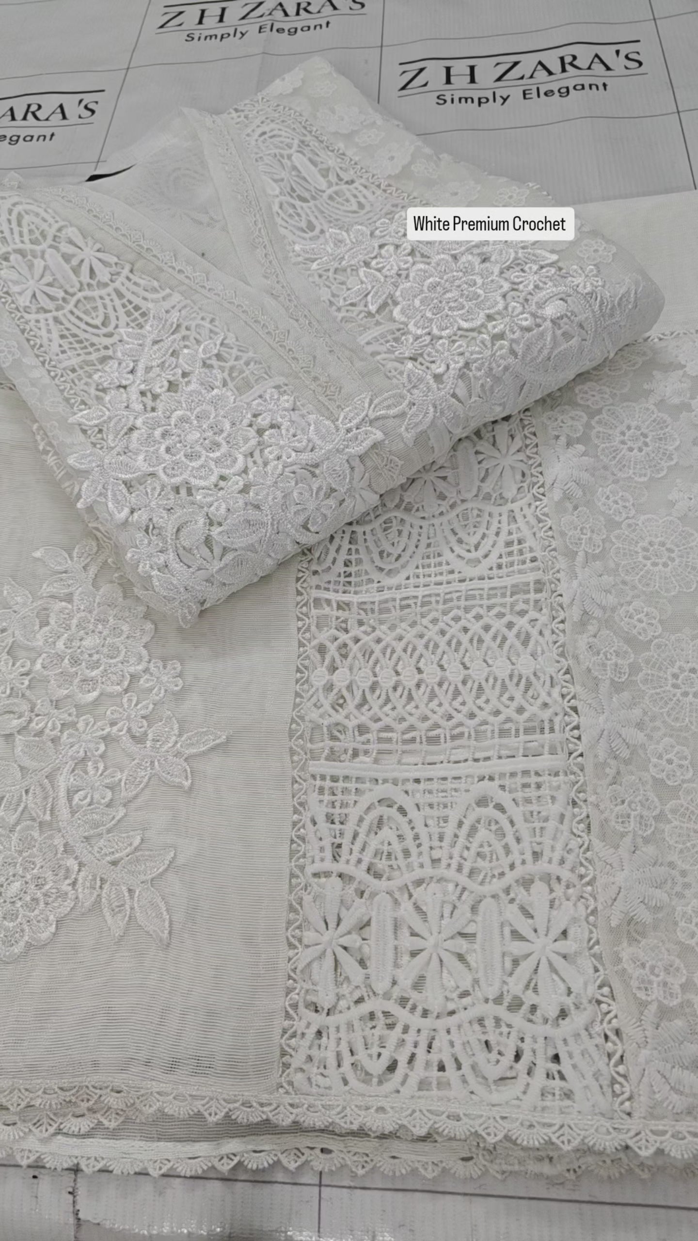Elevate your wardrobe with our stunning collection featuring intricate crochet panels, delicate laces, and exquisite cutwork embroidery Daman. Our pieces offer timeless style and unparalleled craftsmanship. Paired with crochet and embroidery net duppata.