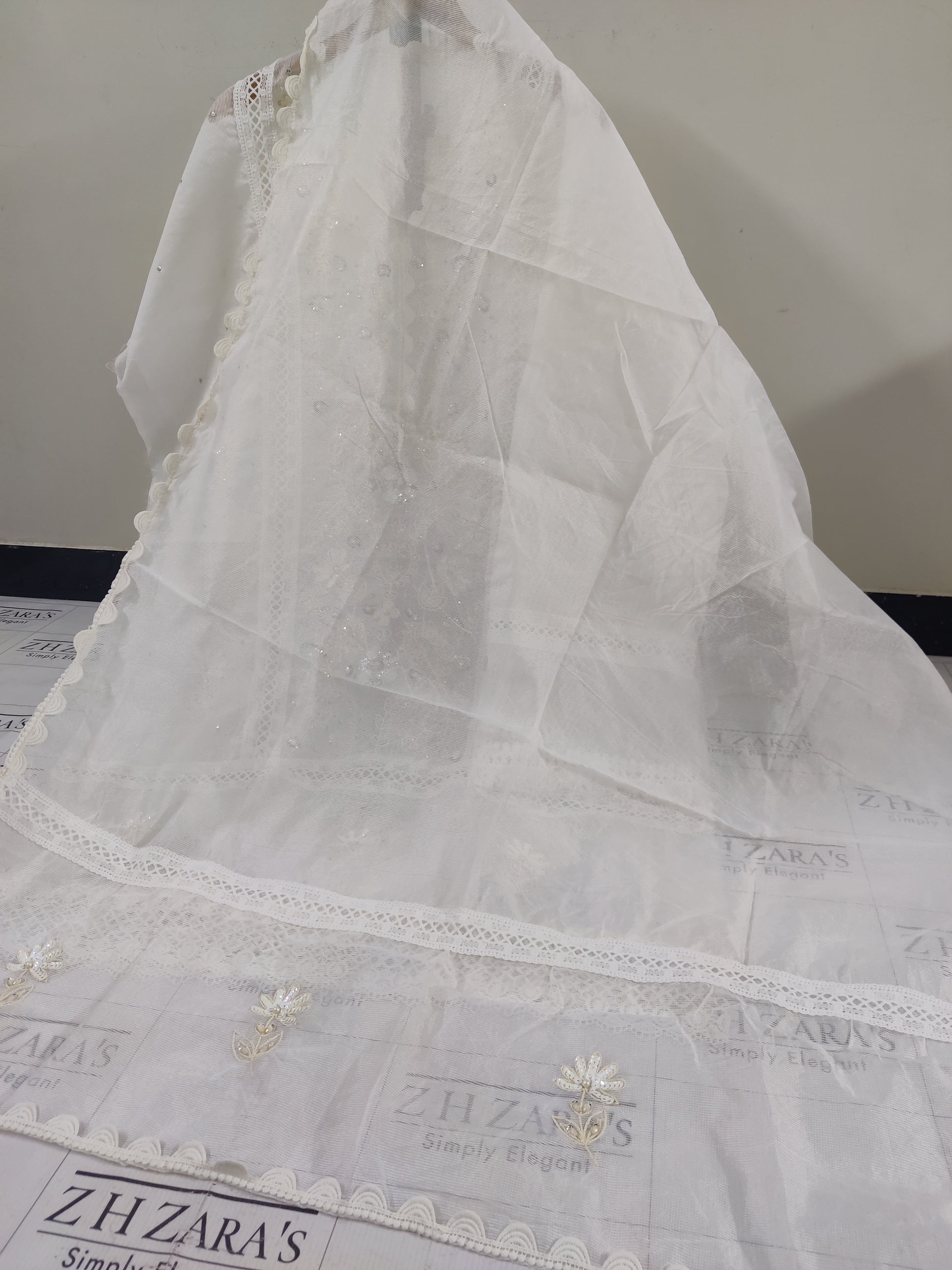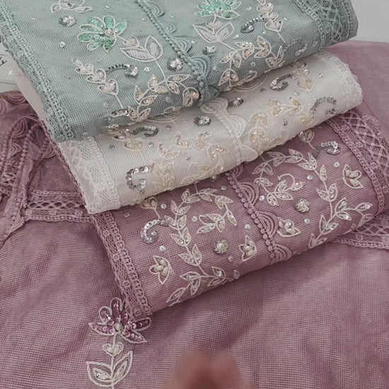 Stand out from the crowd in this elegant sparkling pair. Khadi Net shirt hand painted and hand Embellished with NAKSHI work paired with hand embellished Khaadi Net duppatta.
