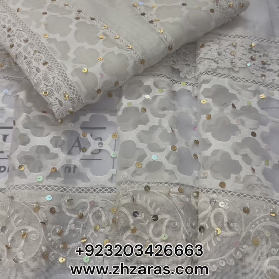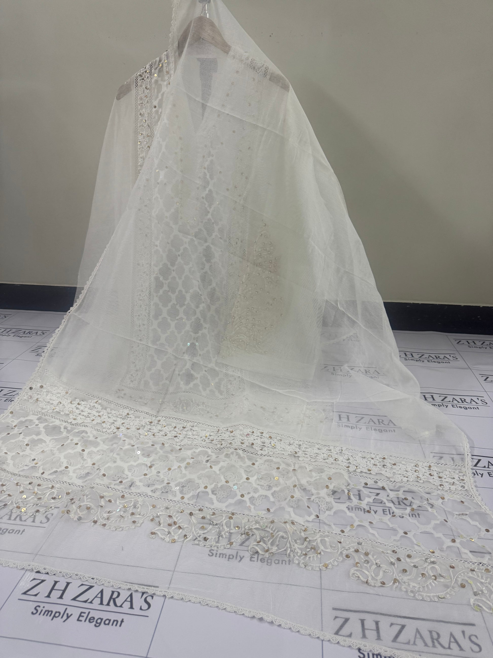 This cotton net shirt is hand embellished with pearls and sequences laces along the front and sleeves paired with a cotton net dupatta with handwork and embroidery for a perfect evening look.