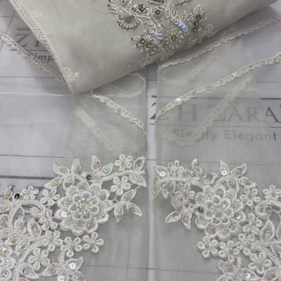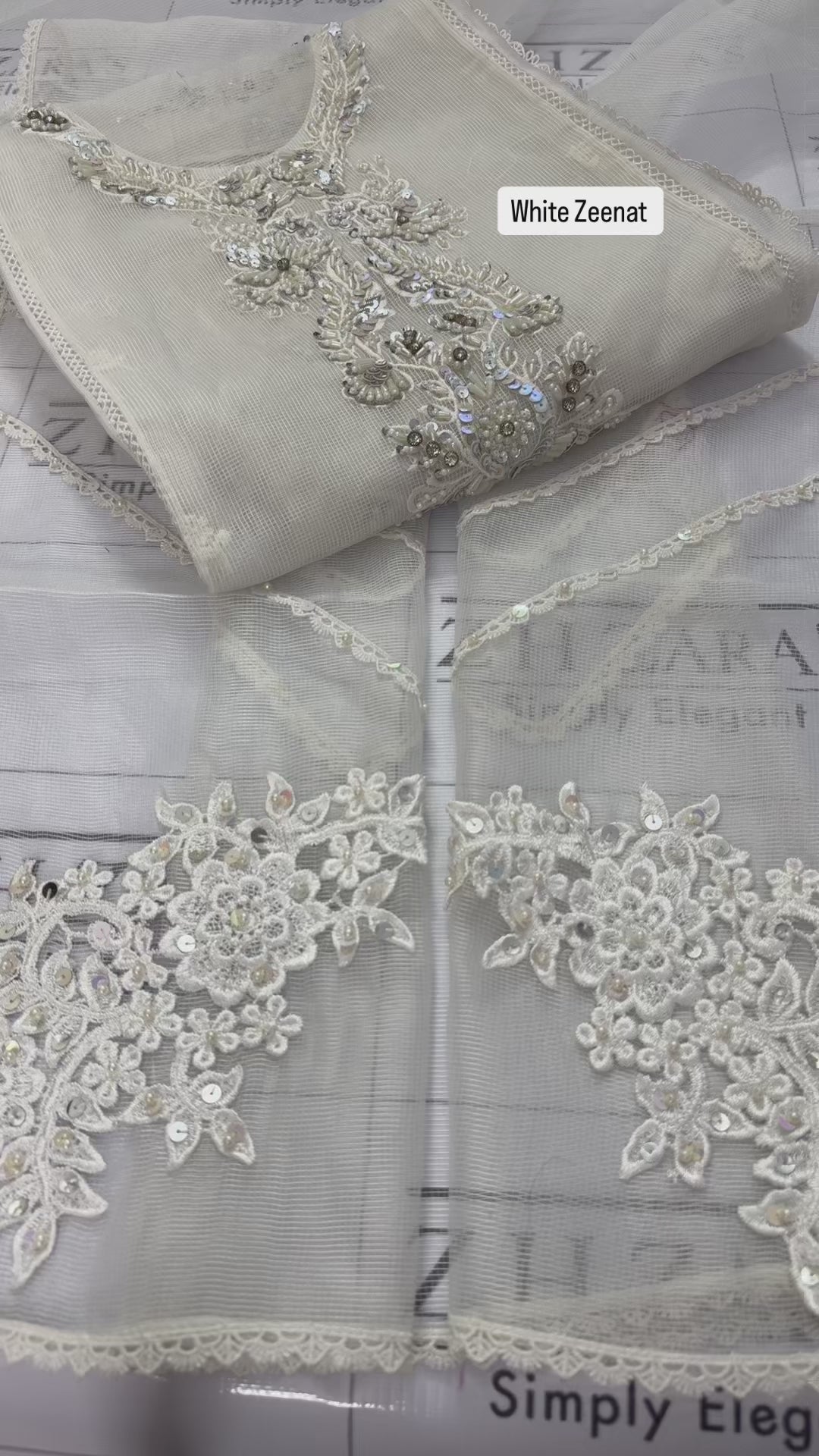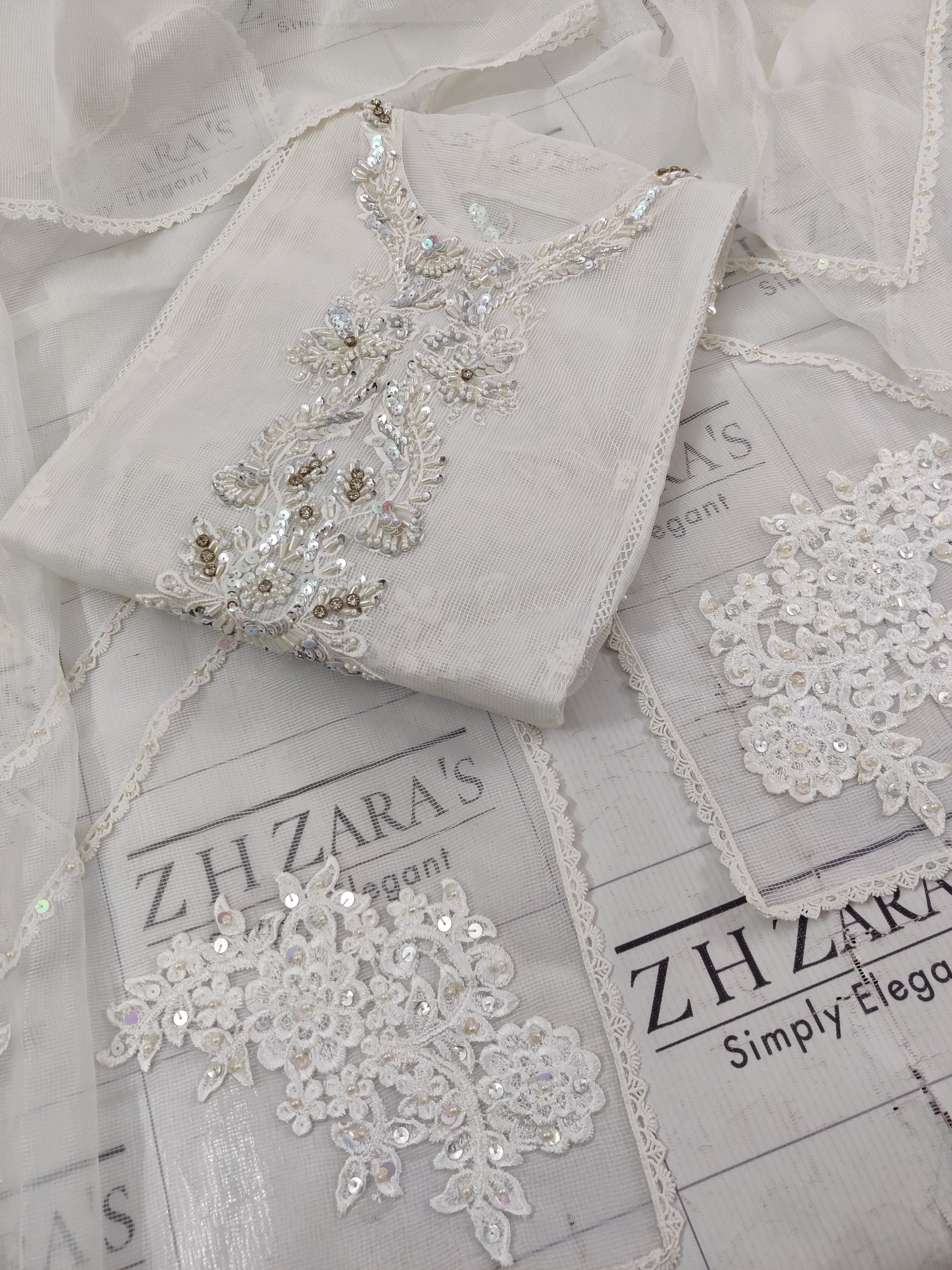This cotton net shirt is hand embellished with pearls and sequences laces along the front and sleeves paired with a cotton net dupatta four sides handwork bunches and embroidery for a perfect evening look.