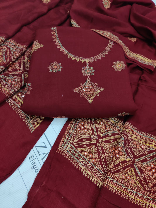 Rusty Maroon Needle Embroidery Pashmina 3pc